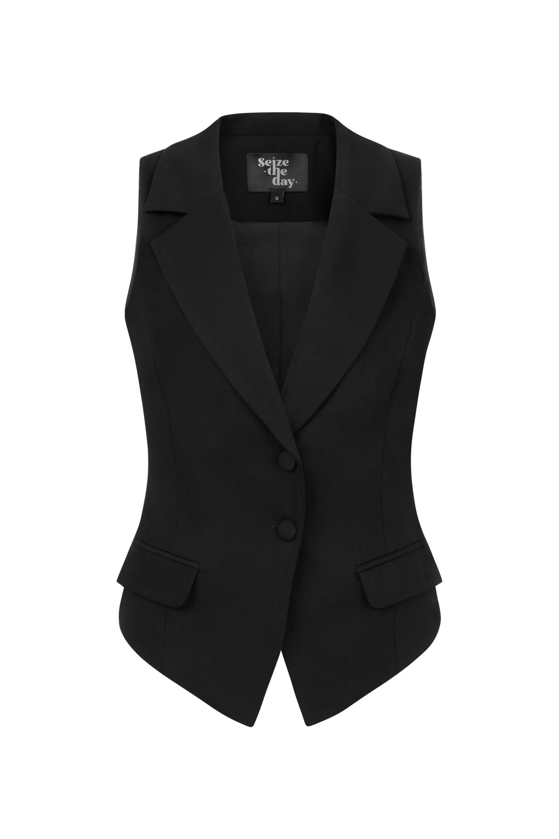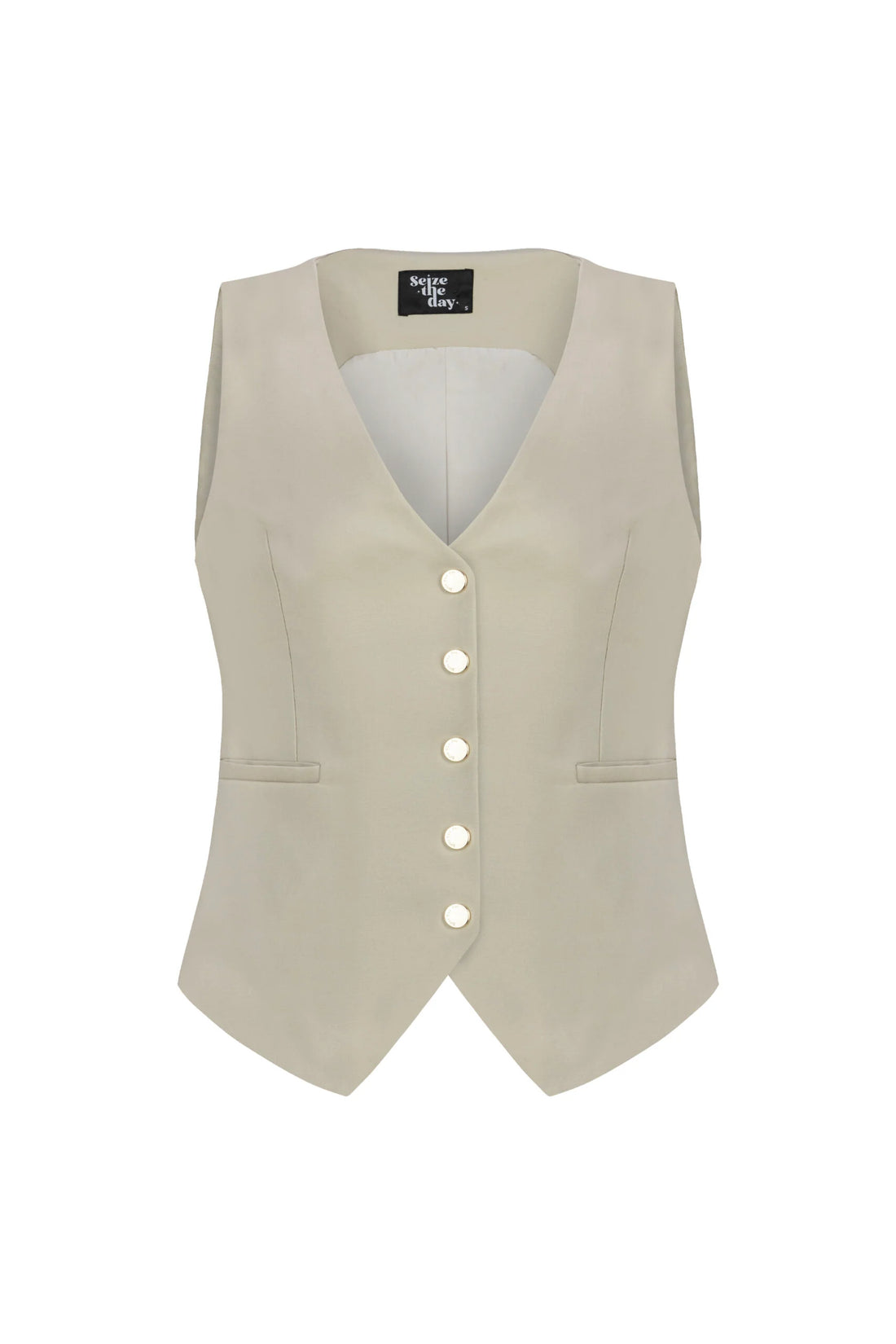 Luna Yelek, kruvaze kapama ve kumaş kaplama düğmeleriyle sofistike bir şıklık sunar. Saten astarıyla konforlu...