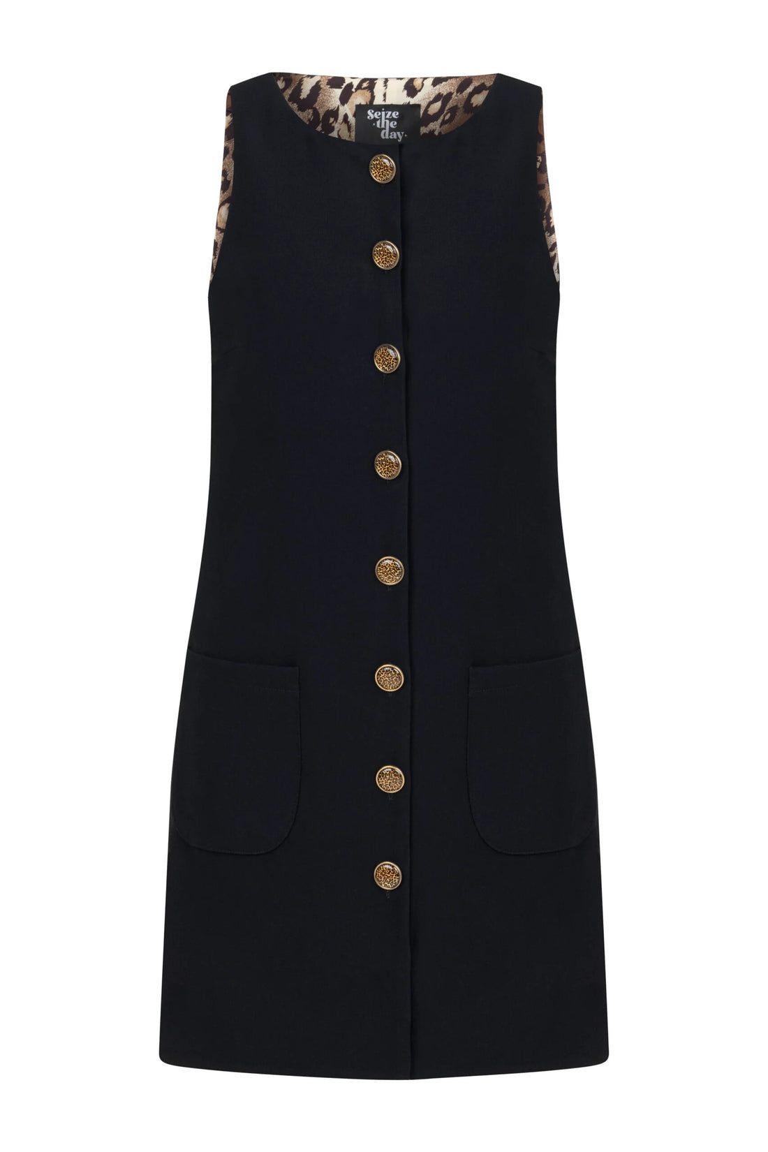 Margot Dress, leopar metal düğme detayı ve saten-leopar astarıyla dikkat çeker. Kısa boyu ve astarlı...