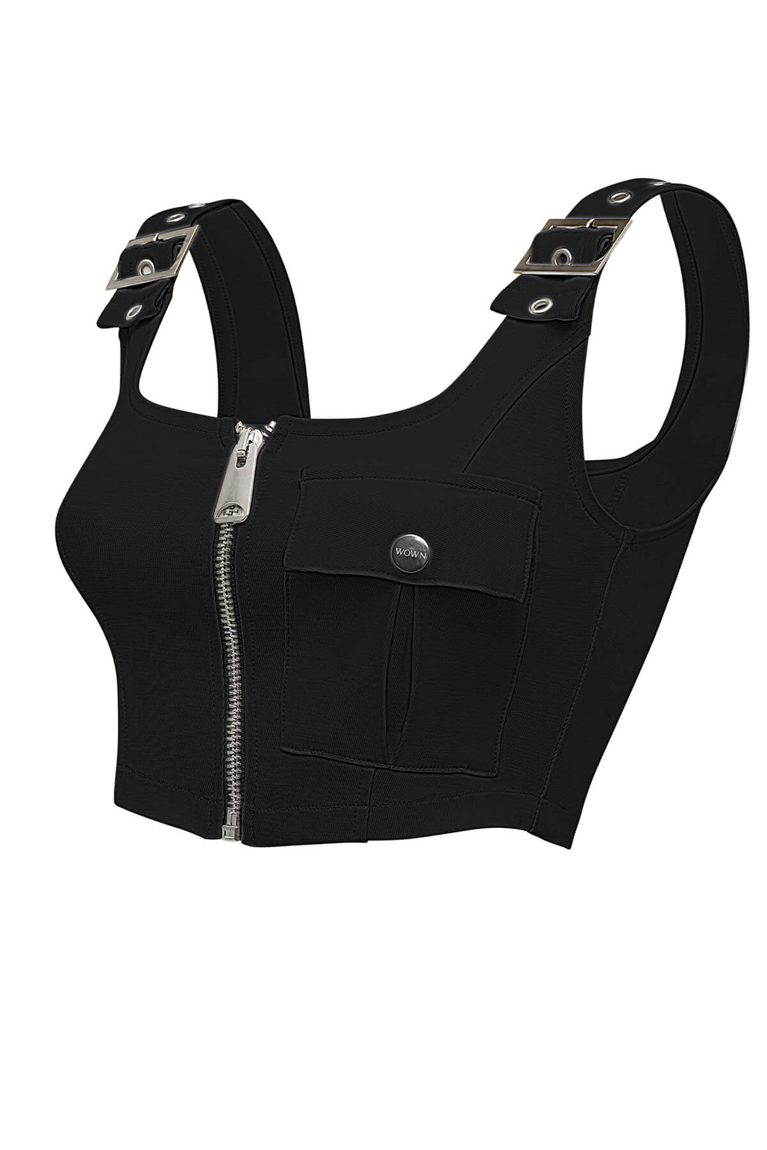 Önden açılır fermuarlı omuzlarda ayarlanabilir askı, önde süs görünümlü cep detayı olan oturtmalı crop