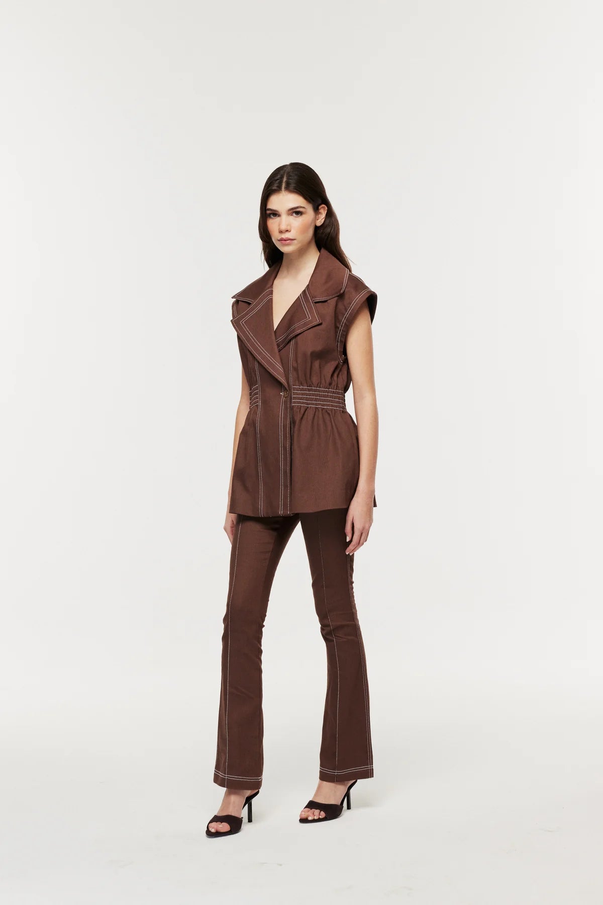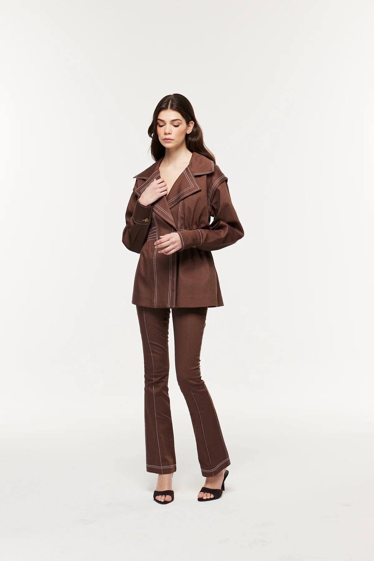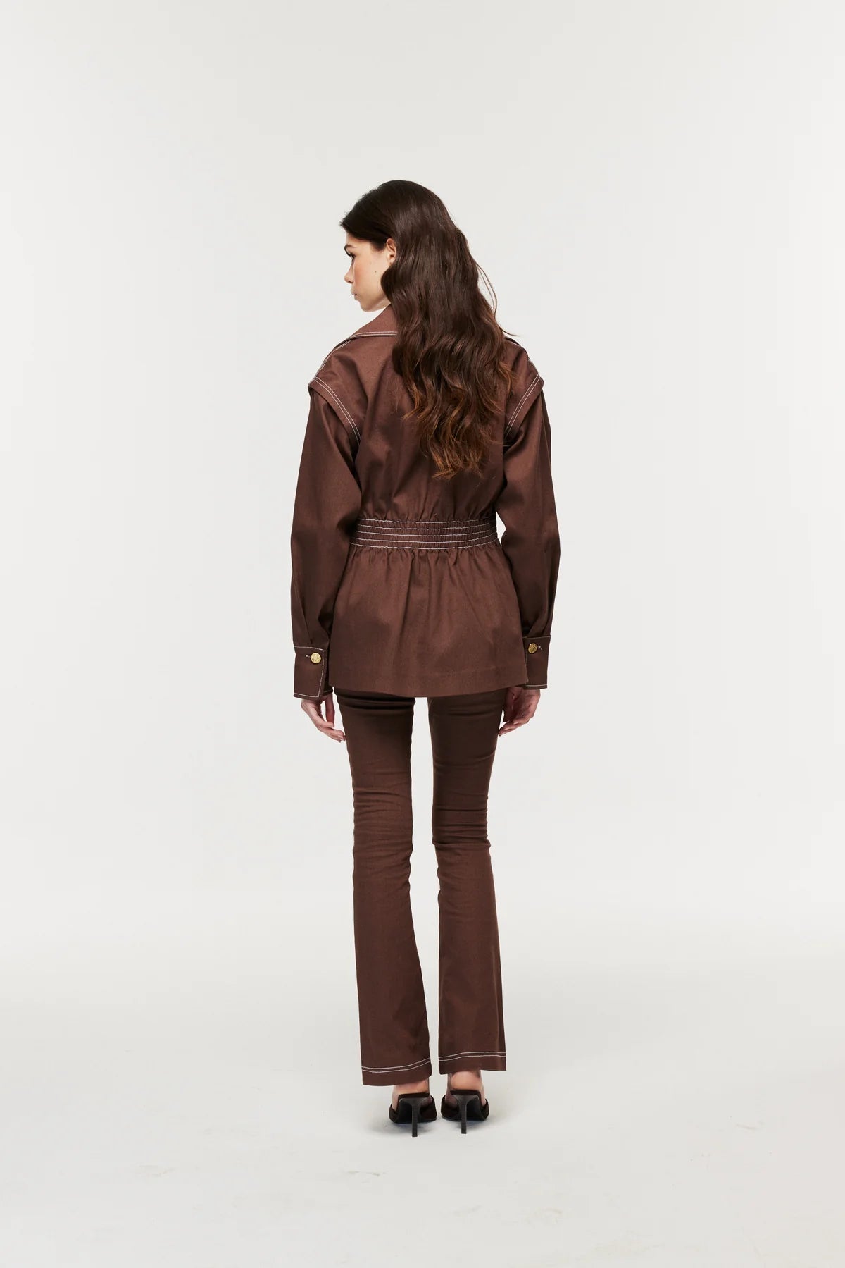 Beli lastikli, kademeli düğme kapamalı gabardin astarlı ceket. Kolları fermuar ile çıkarılıp yelek formuna dönüşebilmektedir.