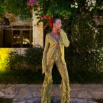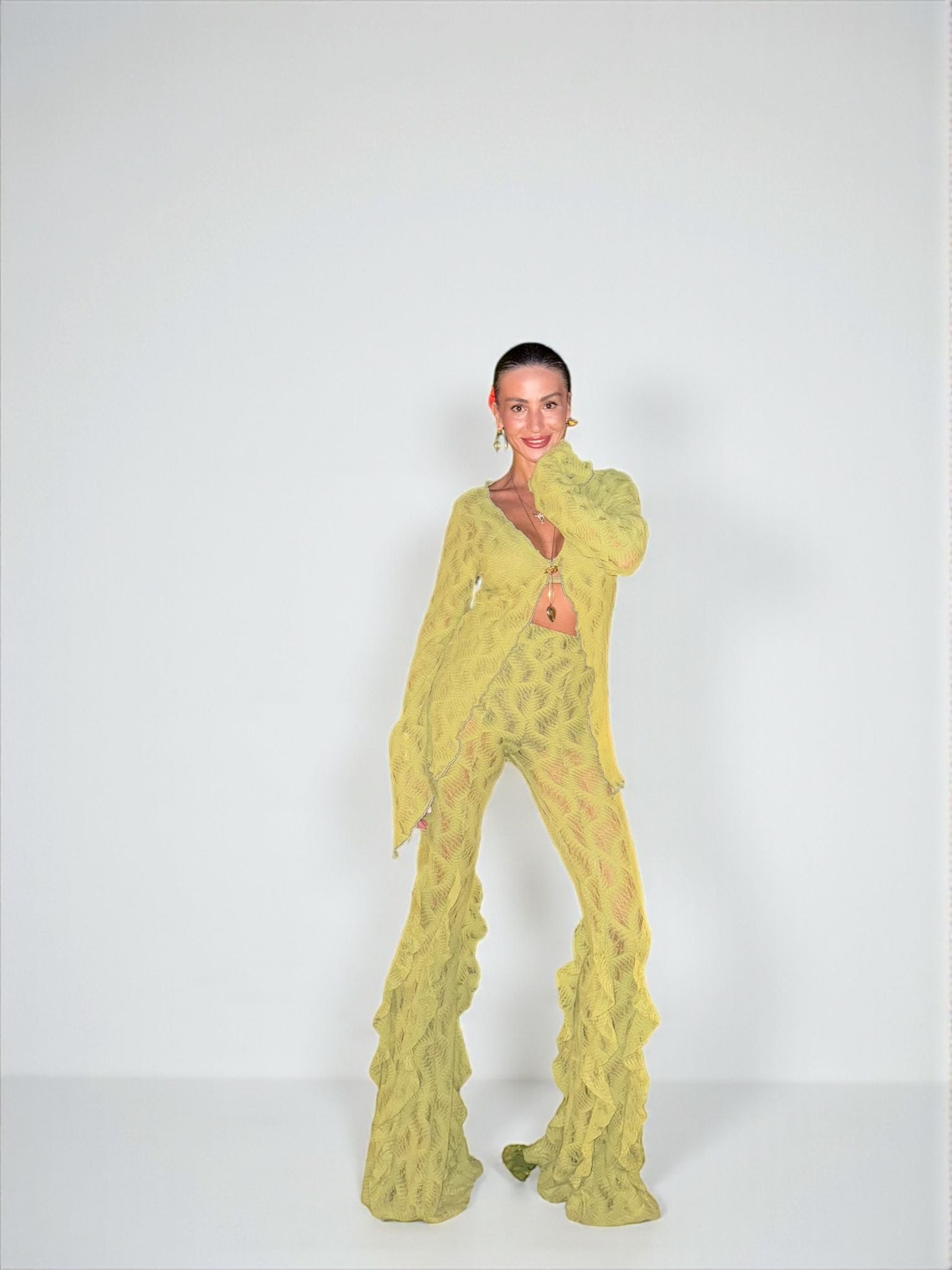 Yumuşak ve esnek dalga dokulu örme kumaştan üretilen bu takım, heykelsi ama zahmetsiz bir siluet oluşturur. Volanlı paçalar ve asimetrik üst, vücutla birlikte akışkan bir hareket yaratır.