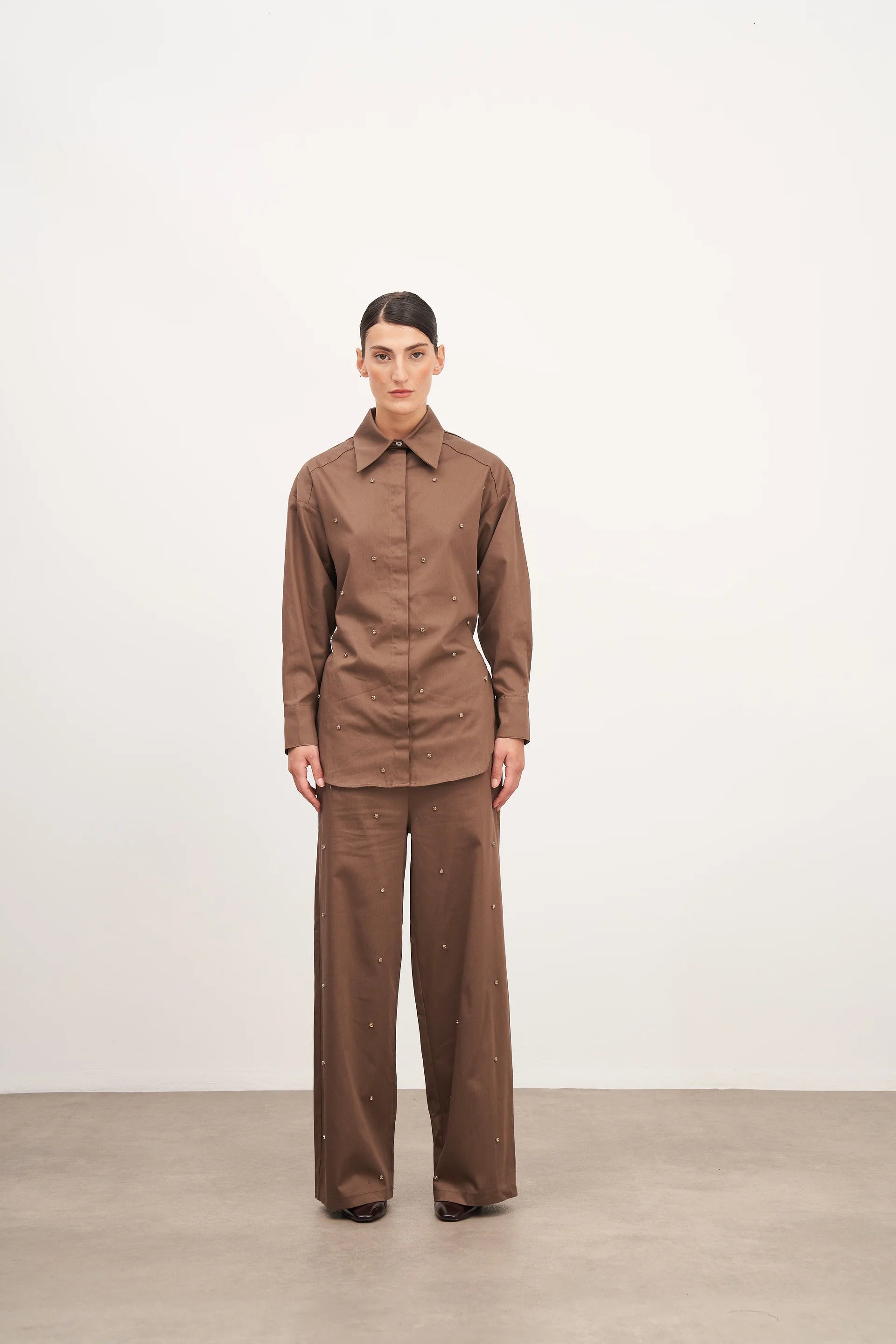 Kahverengi Taş İşlemeli Bağlama Detaylı Pamuk Gömlek