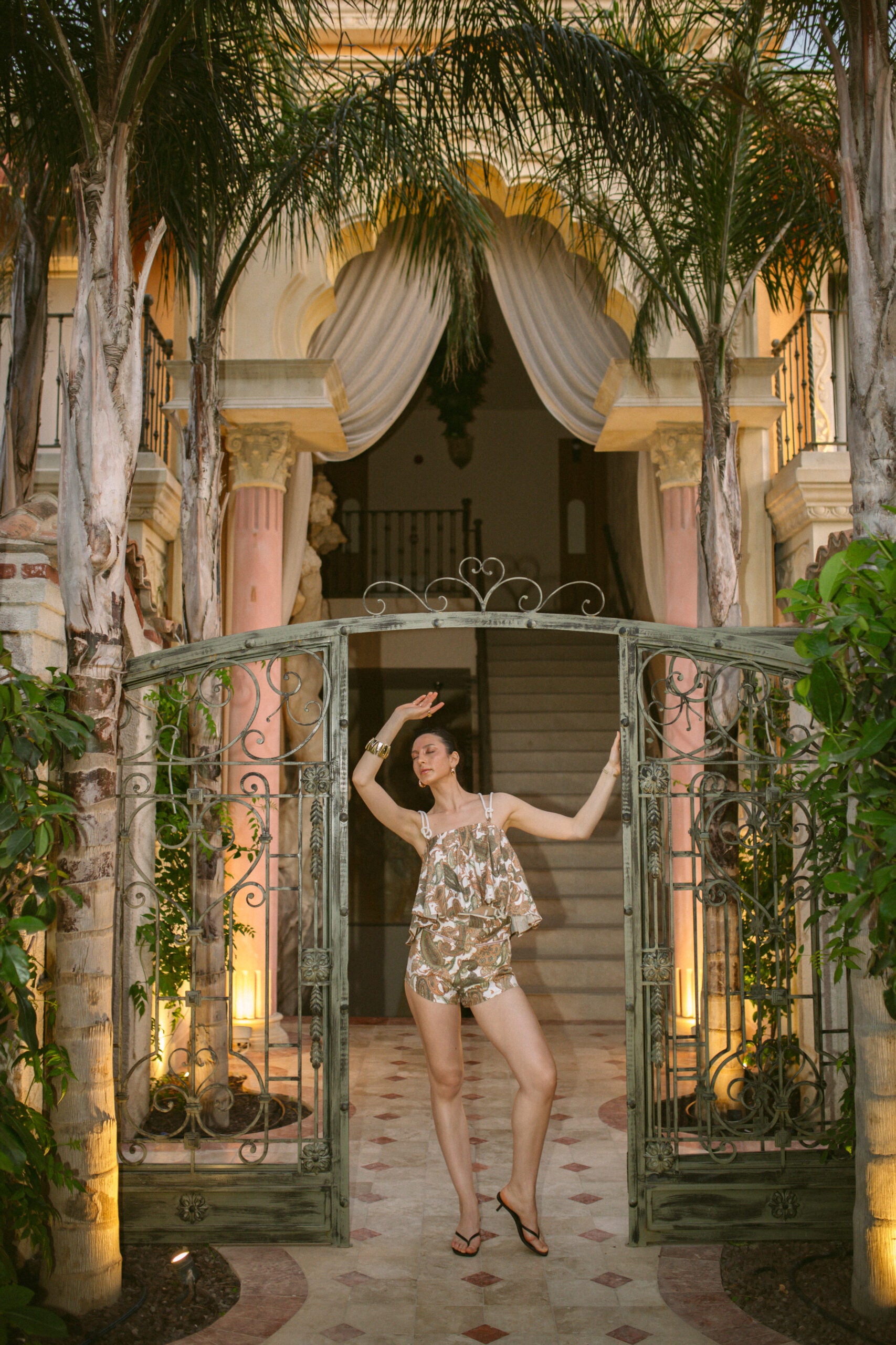 Mira, paisley desenin zarafetini modern bir kesimle buluşturuyor. Üst kısmında yer alan büzgülü form ve kalın ip askılar, hem rahatlığı hem de şıklığı bir arada sunuyor. Yüksek belli şort, vücuda oturan kalıbıyla rahat bir silüet yaratıyor. Yazın enerjisine uygun hafif kumaşı sayesinde şehirde veya sahilde kullanıma uygun bir parça.