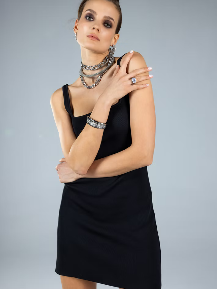 SHIA Elbisesi, minimalist bir örgü temel parçadır ve maksimum etki yaratır. Daha itibarlı bir kare yaka ve geniş askılar tasarlanmış olup, vücudu saran silueti ve mini boyu ile ister tek başına ister katmanlı olarak giyilsin, çok yönlü bir temel üründür.