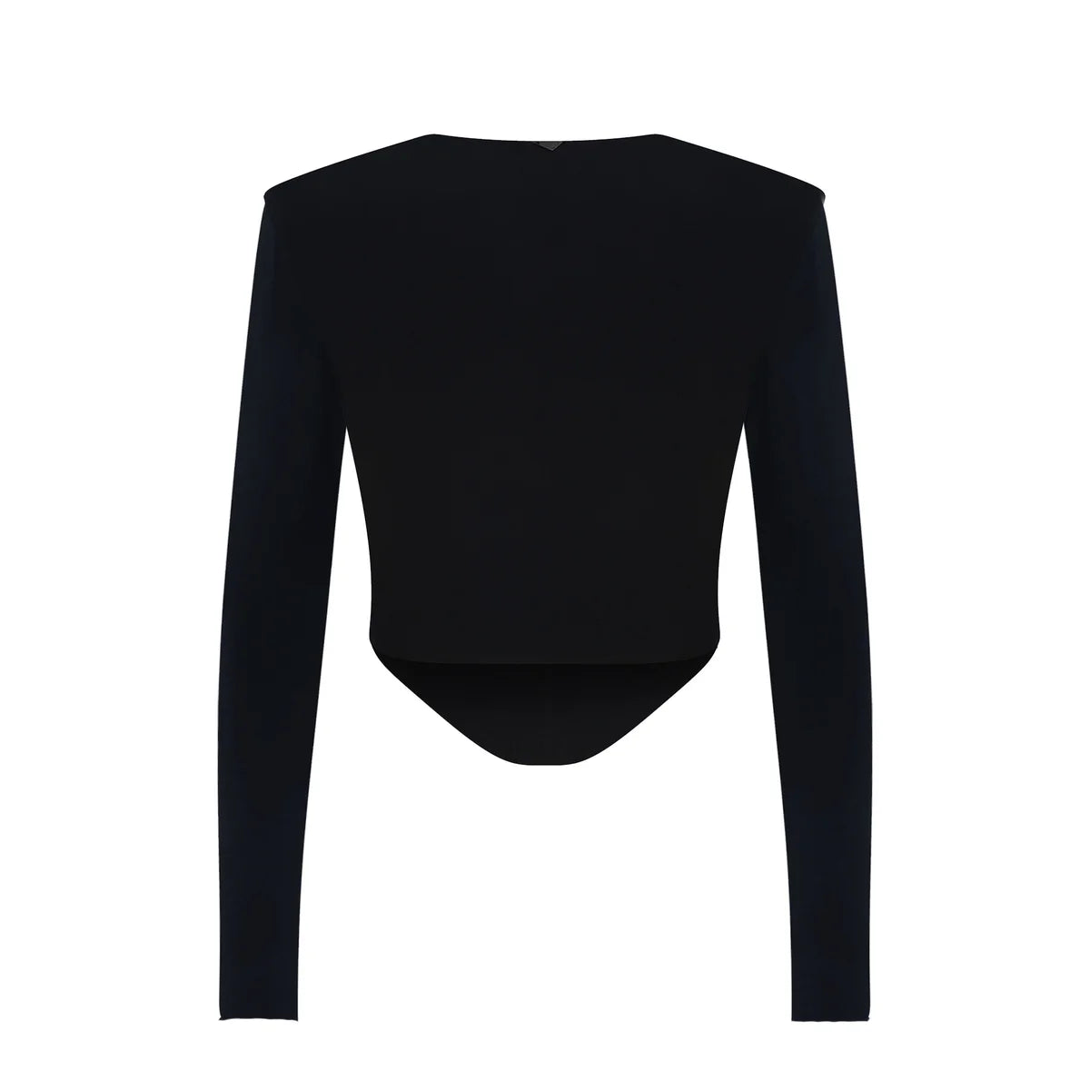 Bu minimalist, uzun kollu, kısa kesimli siyah bluz, omuz vatkalarıyla güçlü bir silüet oluştururken, ön kısımdaki korse tarzı yapısal paneller vücuda oturan, modern ve sofistike bir estetiği vurguluyor.